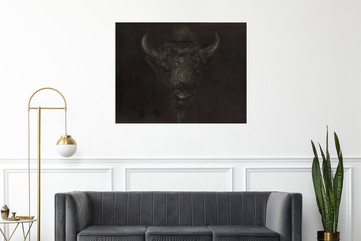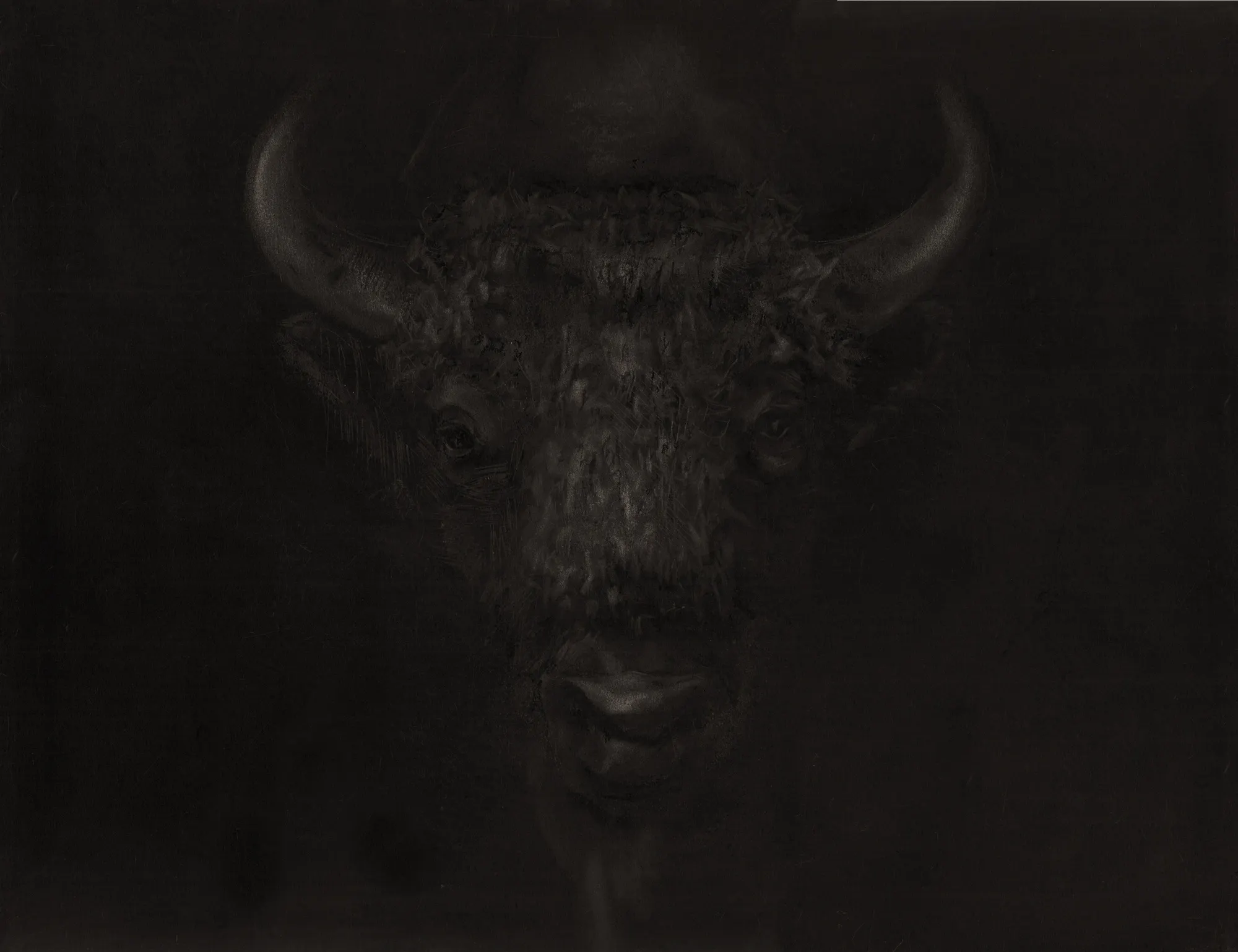 Dessin figuratif, contemporain sur papier, représentant la tête d’un bison polonais « Zubrowska » émergeant frontalement d’un fond sombre. Animal de grandes plaines, différent de son cousin le bison américain.