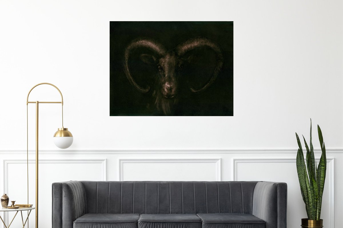 Dessin figuratif, contemporain sur papier, représentant la tête d’un mouflon émergeant frontalement d’un fond sombre. Animal des montagnes, endroit ou le réchauffement climatique est accéléré.